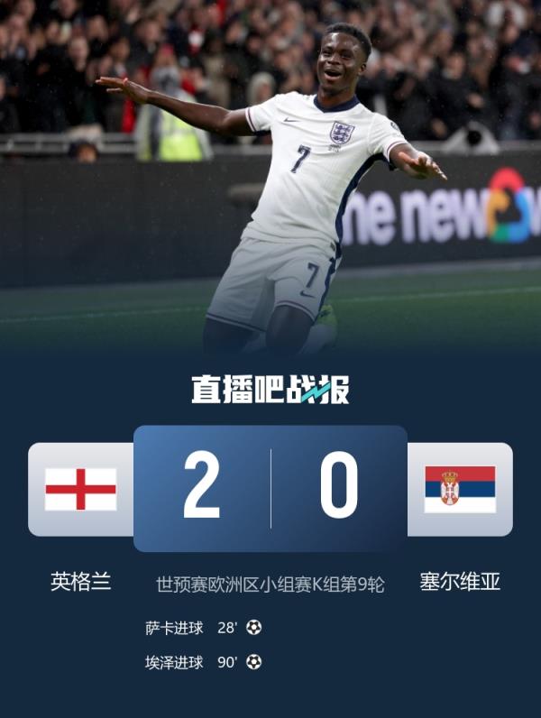 本轮世预赛欧洲区K组,已经出线的英格兰2-0拿下塞尔维亚,萨卡和埃泽这两名阿森纳球员各入一球。