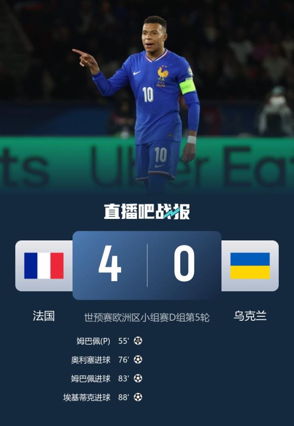 世预赛欧洲区D组,法国4-0横扫乌克兰,姆巴佩双响并解锁生涯400球,法国队提前晋级世界杯!
