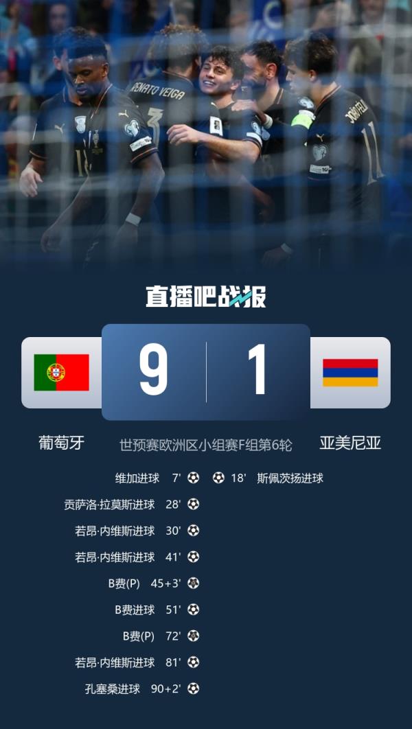 世预赛欧洲区小组赛F组第6轮,葡萄牙9-1狂胜亚美尼亚,B费、若昂·内维斯帽子戏法。