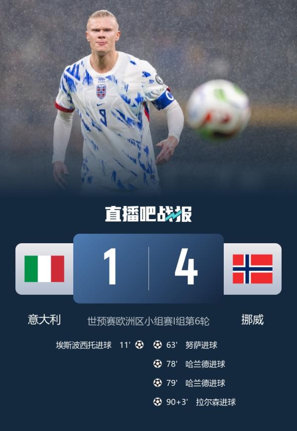 世预赛欧洲区小组赛I组第6轮,挪威客场4-1逆转意大利,哈兰德梅开二度。
