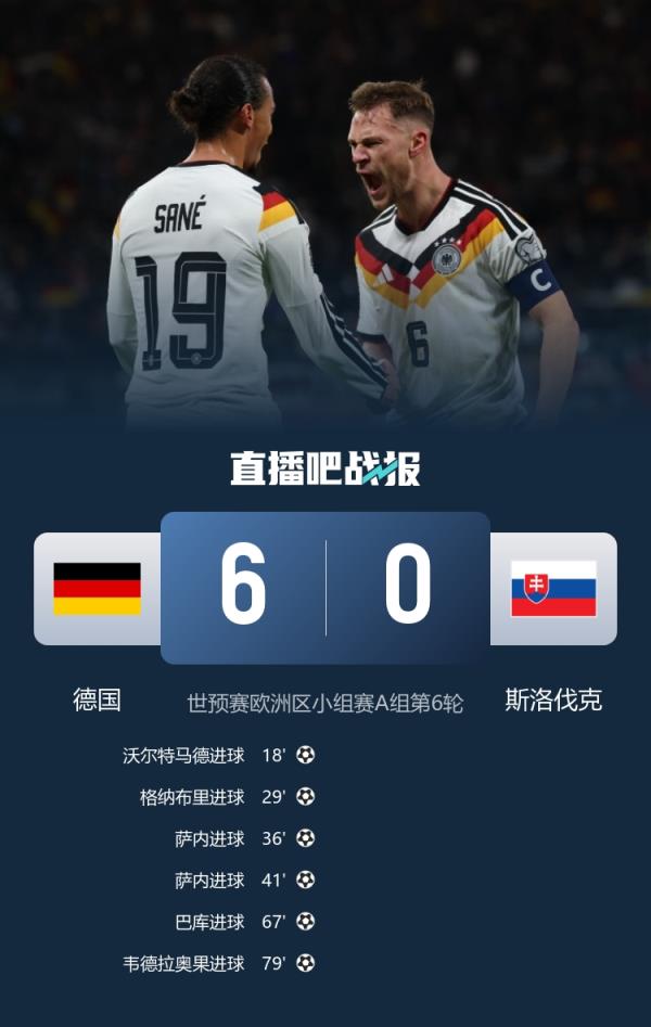 世预赛欧洲区小组赛A组第6轮,德国6-0大胜斯洛伐克,萨内梅开二度。