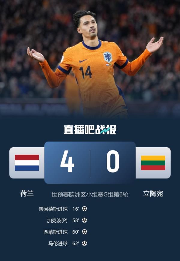 世预赛欧洲区小组赛G组第6轮,荷兰4-0立陶宛,赖因德斯、加克波传射。